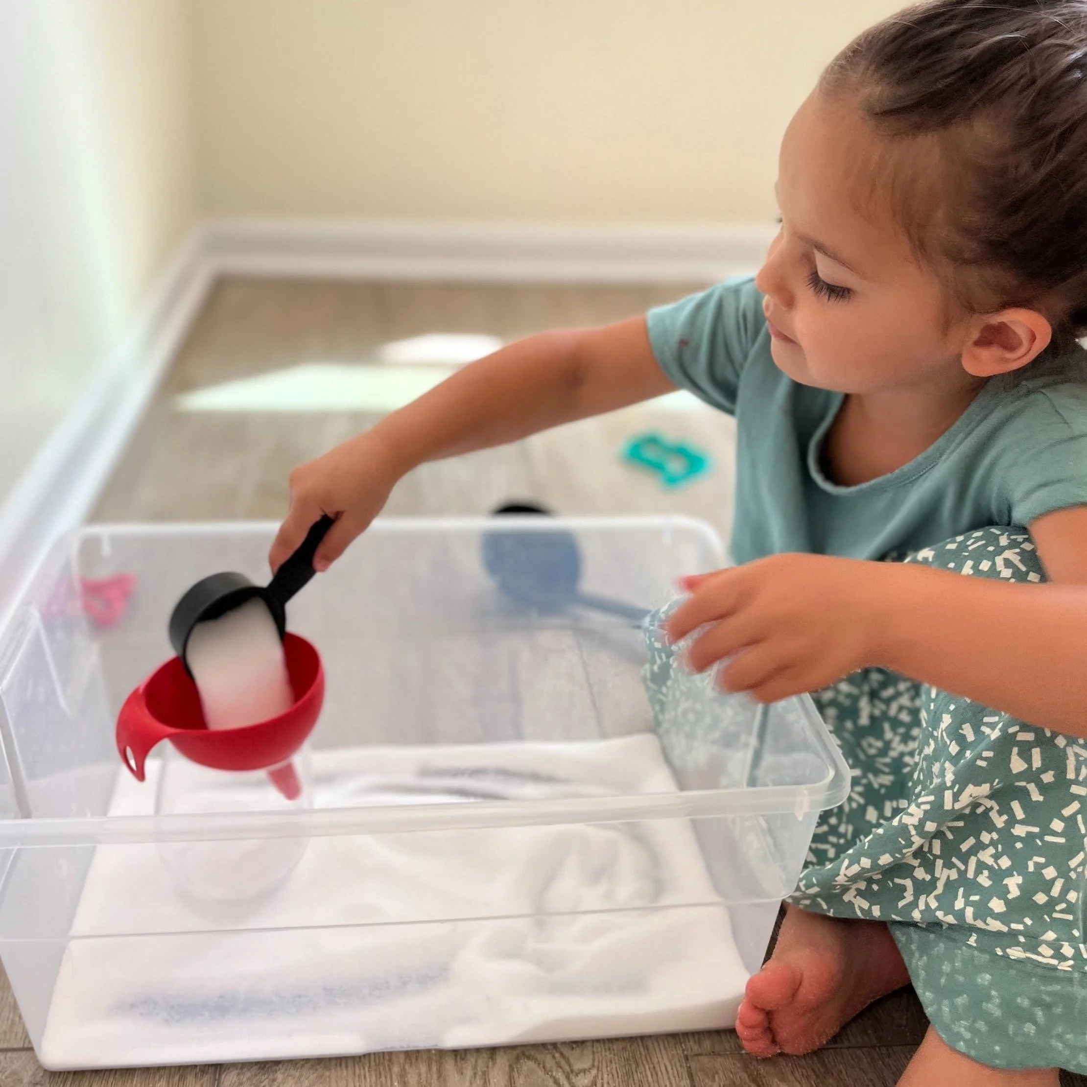 She eventually figured out the funnel was very fun as well, but this is when the salt started escaping the sensory bin! If you only briefly skimmed the clean up part, please use a towel or go outside. This only took a few minutes to vacuum, so your day isn’t toast if you risk it, but I like to make things as easy as possible whenever I can.
